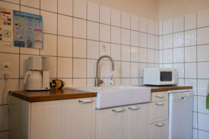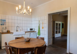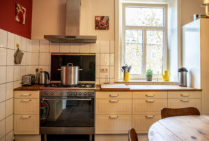La cuisine est équipée d’une grande cuisinière au gaz avec four, d’un frigo, d’un four à micro-ondes, d’un grille pain, d’un mixeur, d’un lave-vaisselle, d’une cafetière, d’ustensiles de cuisine et de vaisselle.