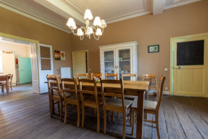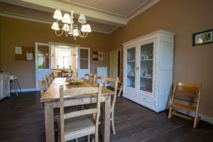 La salle à manger avec une table de ferme de 10 places qui trône au milieu de la pièce, deux chaises hautes pour enfant sont disponibles.