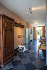 Au bout du couloir on a accès directement à une terrasse privative en pierre bleue avec barbecue, table, chaises, parasol et transats.