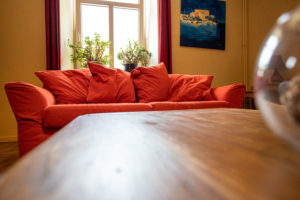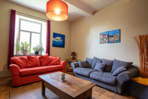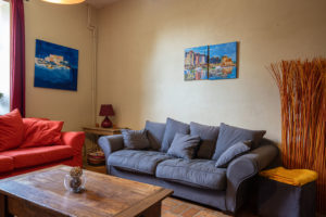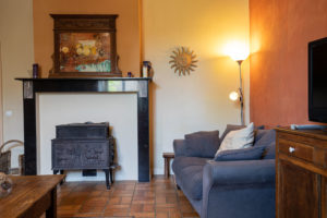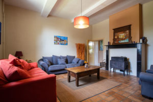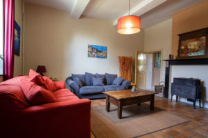 Dans le salon vous trouverez : deux canapés 3 places dont un convertible, un canapé 2 places, une SMART TV, une chaine Hifi ainsi qu’un poêle à bois.