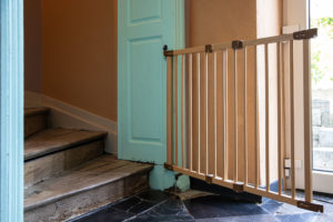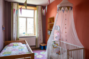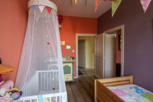 Qui communique directement avec une chambre pour bébé équipée d’un lit cage, un lit une personne avec protection latérale et une table à langer.