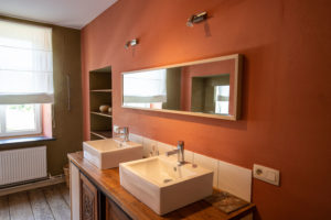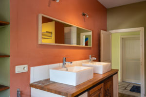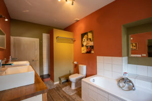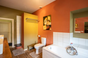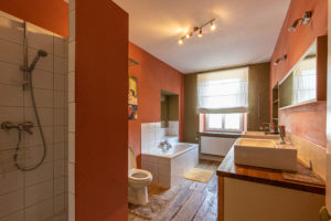 Et pour finir, une salle de bain disposant d’une douche, d’une baignoire, de deux éviers et une toilette.