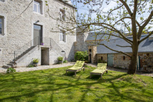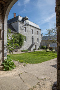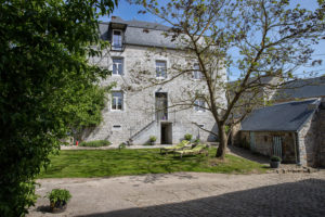 Les bâtiments en pierres du pays bordent une cour intérieure comprenant un grand parking et un coin de pelouse.